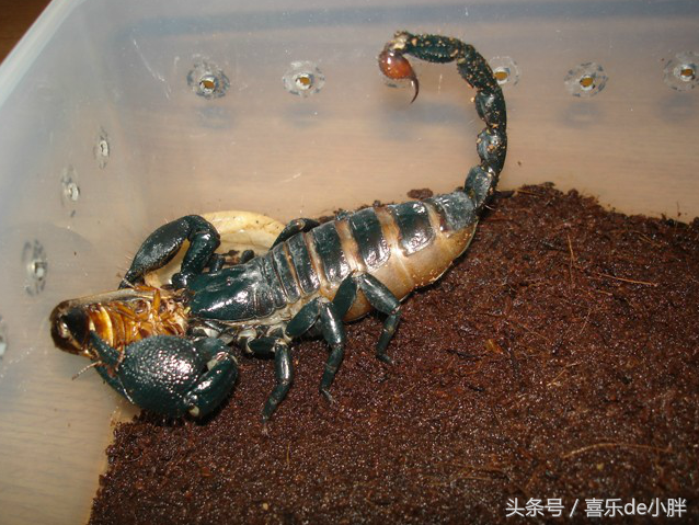 非洲帝王蝎较粗而圆,甲壳又黑又硬,其最大的特征就是长有一对巨大的螯。